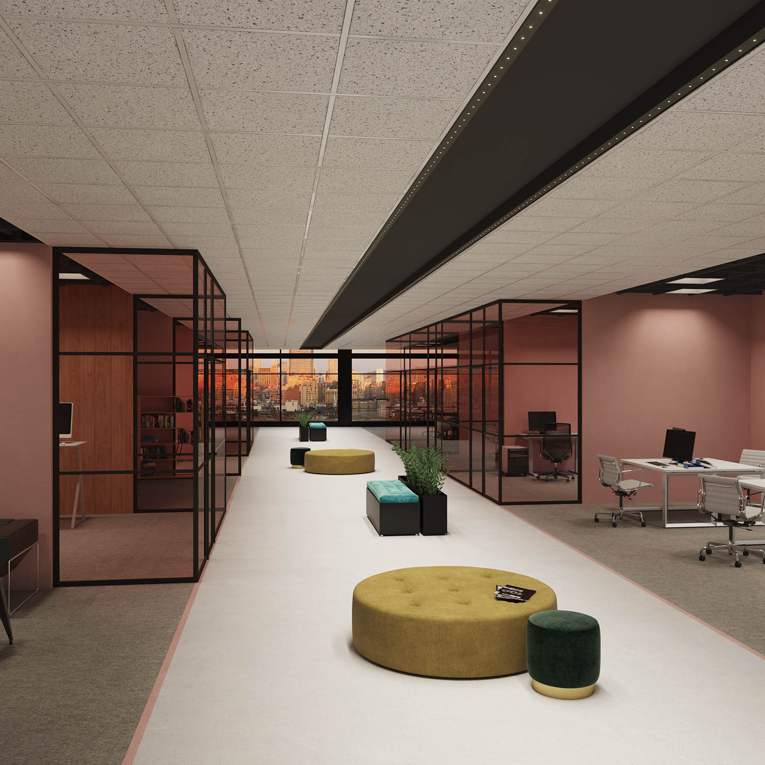 OPTICS Lens made of PMMA, retracted from the bottom surface of the luminaire, emitting light through perforation on the surface. Retraction from the perforation enables invisibility of the light source, providing full visual comfort.